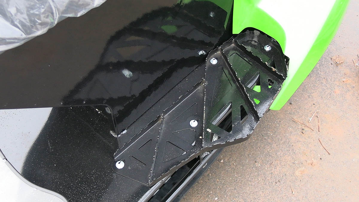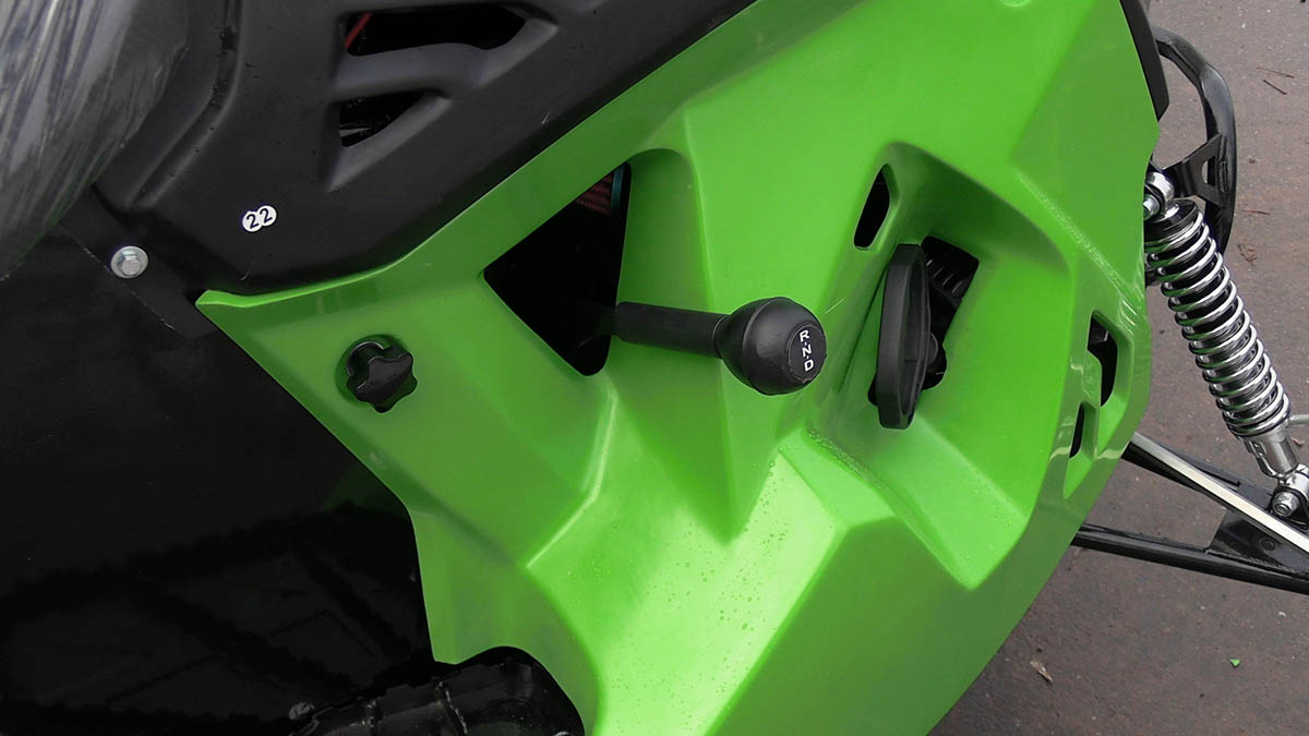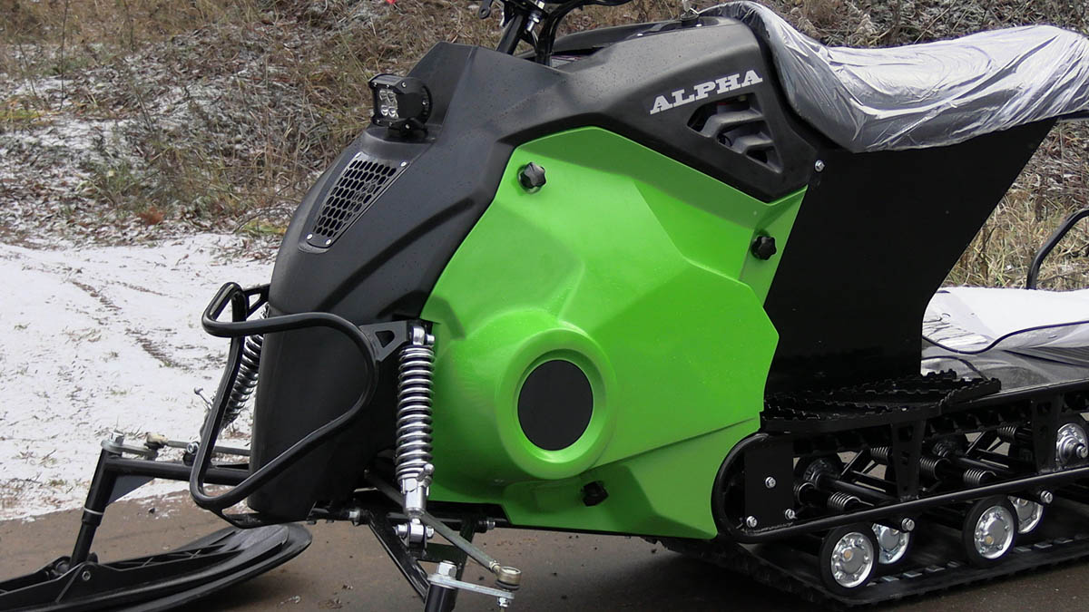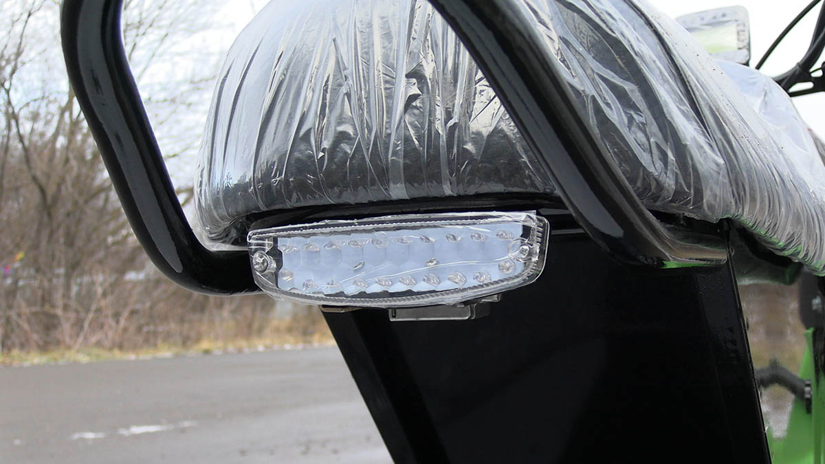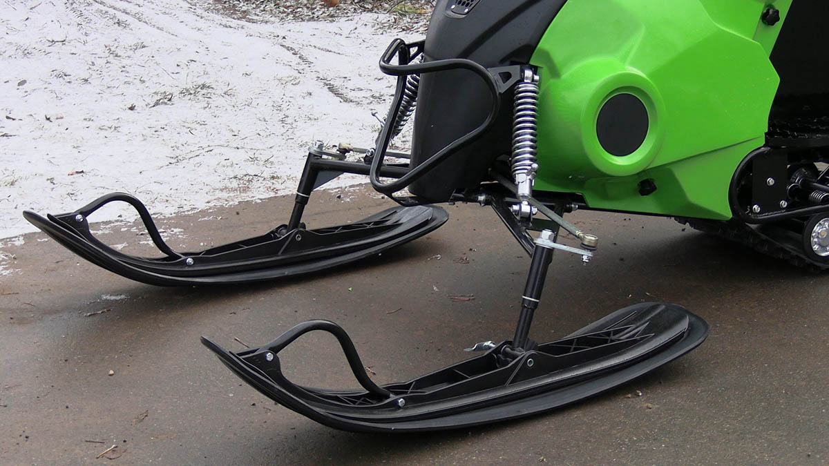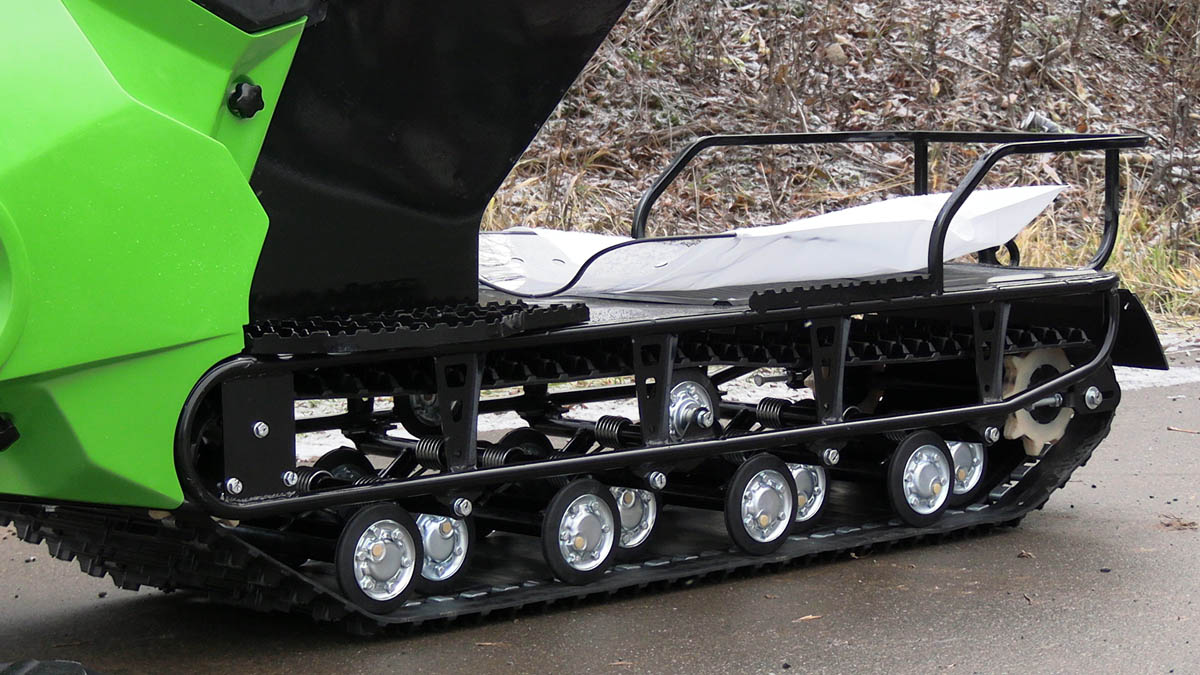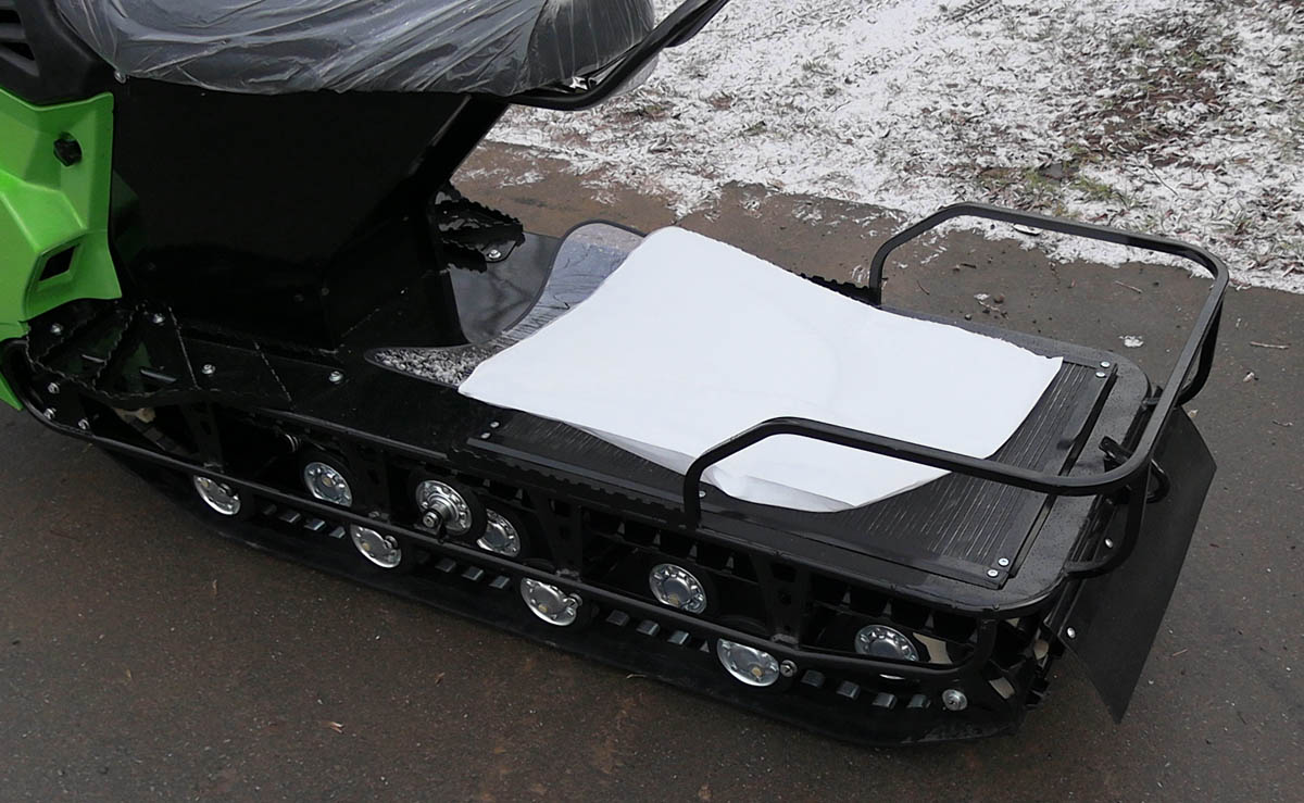Также у буксировщика широкая колея и в комплект поставки входит накладки на лыжи, которые позволяют увереннее двигаться буксировщику по более глубокому снегу. Есть панель приборов, ветровик, подогревы рукояток и курка газа, что делает поездку более комфортной. Под седлом расположен багажный отсек, есть прицепное устройство для того, чтобы можно было зацепить сани волокуши.