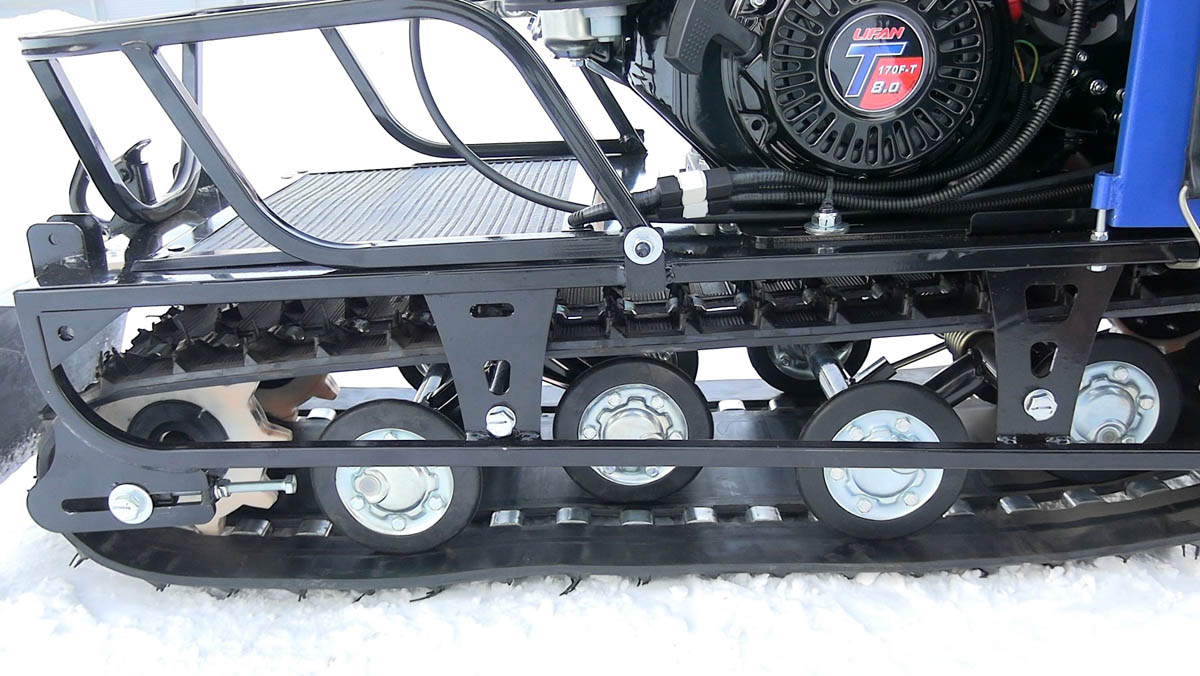 Из импортных комплектующих применяются проверенные за много лет и наиболее распространенные в России двигатели LIFAN. Для двигателей LIFAN легко найти запчасти на рынке, в большинстве случаев запчасти не взаимозаменяемые с другими китайскими двигателями. Есть модификации с двигателями ZONGSHEN и MAGNUM, которые не уступают по качеству LIFAN, но чуть более доступны по цене. В основном же применяются российские комплектующие - вариатор и детали трансмиссии - г. Рыбинск, гусеница - г. Курск, рама и прочие корпусные детали, коробка реверса, лыжи - ИжТехМаш, г. Ижевск. В трансмиссии используются более дорогие приводные цепи - производства Даугавпилс (https://ru.wikipedia.org/wiki/DITTON), завод производит цепи с 1949 года и они превосходят по качеству китайские и российские аналоги. В целом, в конструкции использованы широко доступные на рынке комплектующие, поэтому найти при необходимости нужную запчасть не составит особого труда. В частности, любые запчасти вы можете приобрести в нашем магазине.