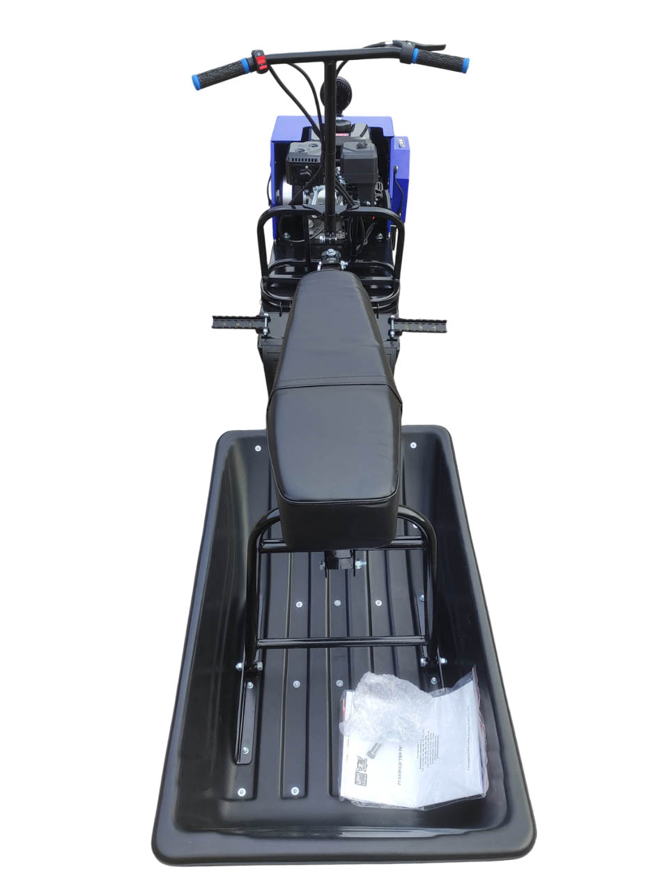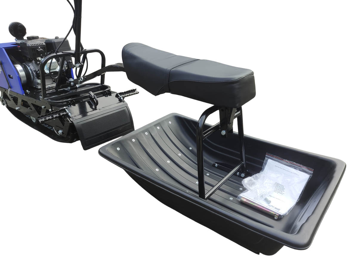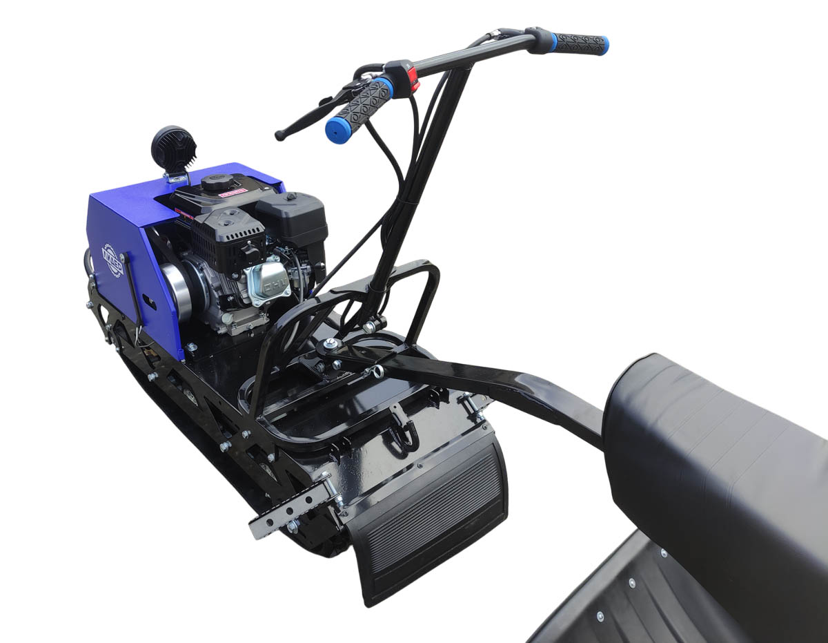 Буксировщик весит больше 100 кг, поэтому пневматическая подвеска меньше забивается снегом, поскольку там нет пружин, такая подвеска более комфортна, колесики пневматические обеспечивают мягкость.