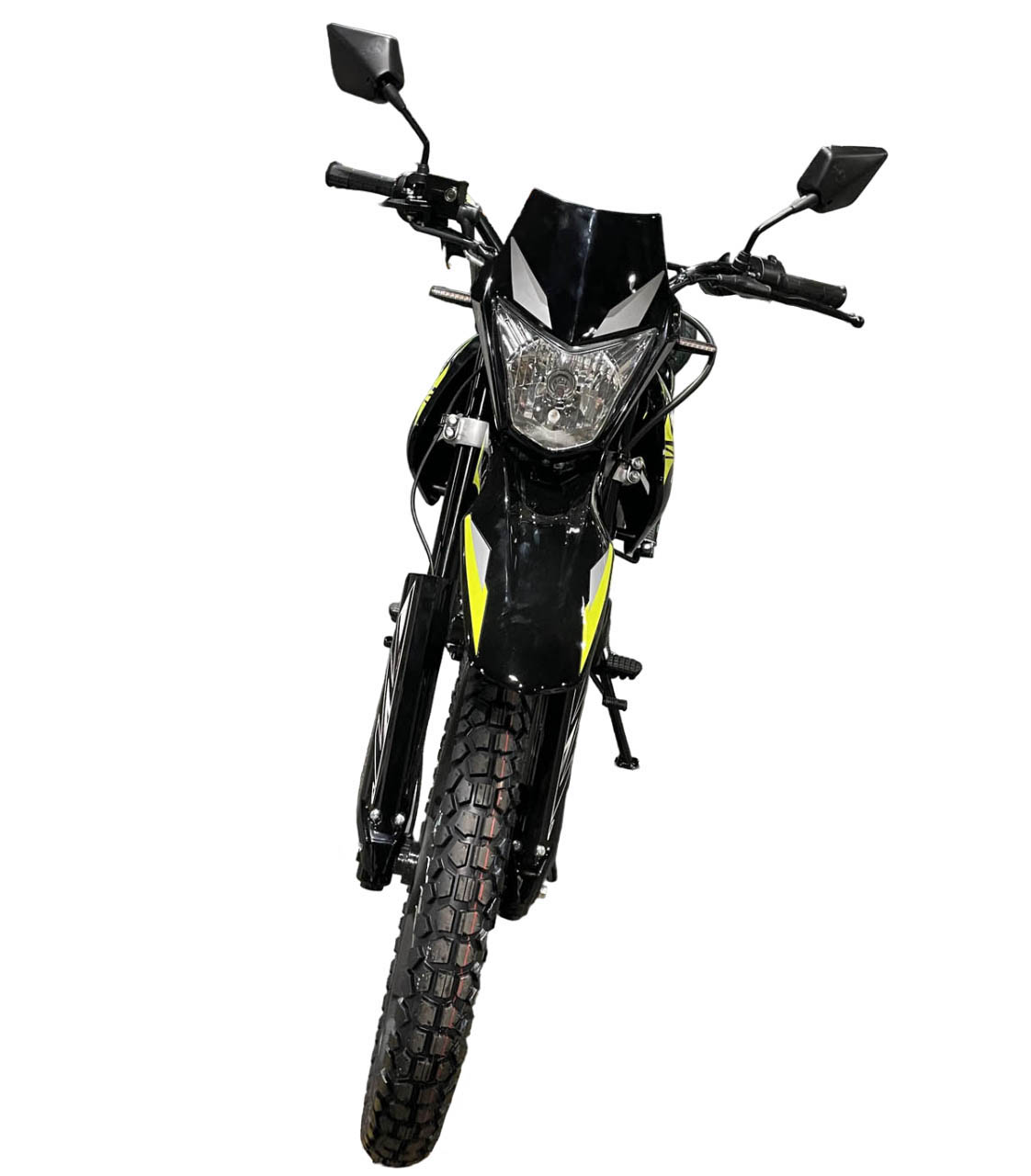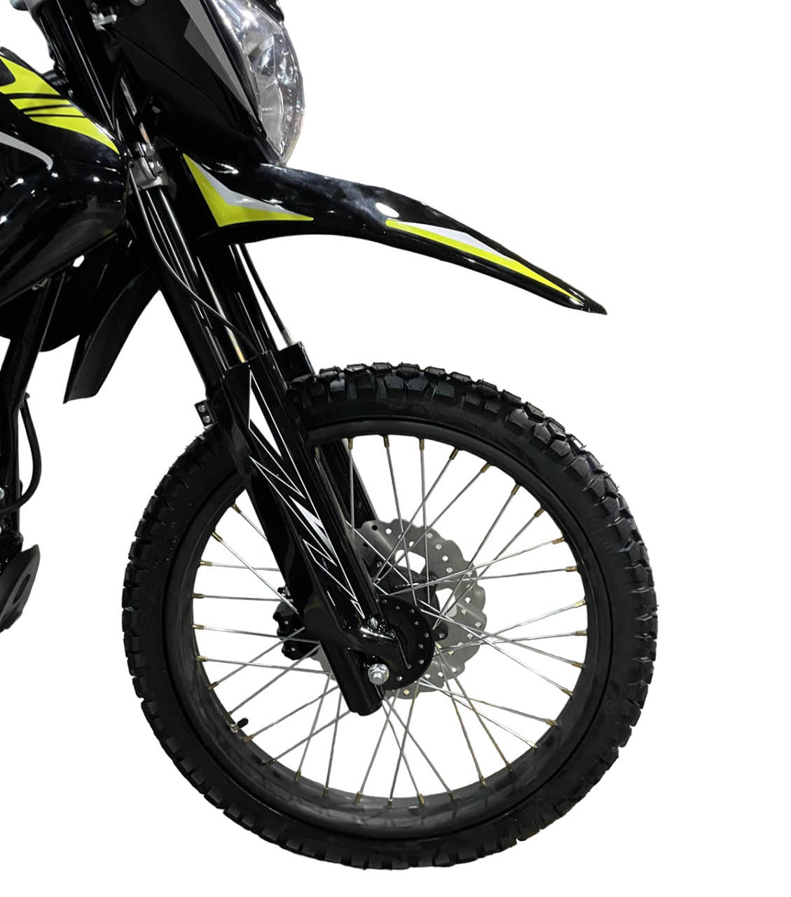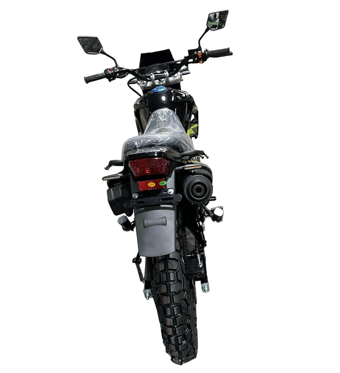 Высота посадки небольшая, примерно 800 мм, т.е. он подходит людям любого роста, на нем комфортно ехать, сесть на мотоцикл и слезть с него, удобно людям любого роста. Подножки смещены вперед, для удобства в долгих поездках, установлены пульты мотоциклетного типа и полноценная светотехника, в отличие от мотоциклов внедорожного типа, где установлены упрощенные пульты управления и усеченная панель приборов. Колеса размерностью 80/100-21, 120/80-18", с комбинированным рисунком (асфальт/грунтовка), передний и задний тормоз - дисковые гидравлические.