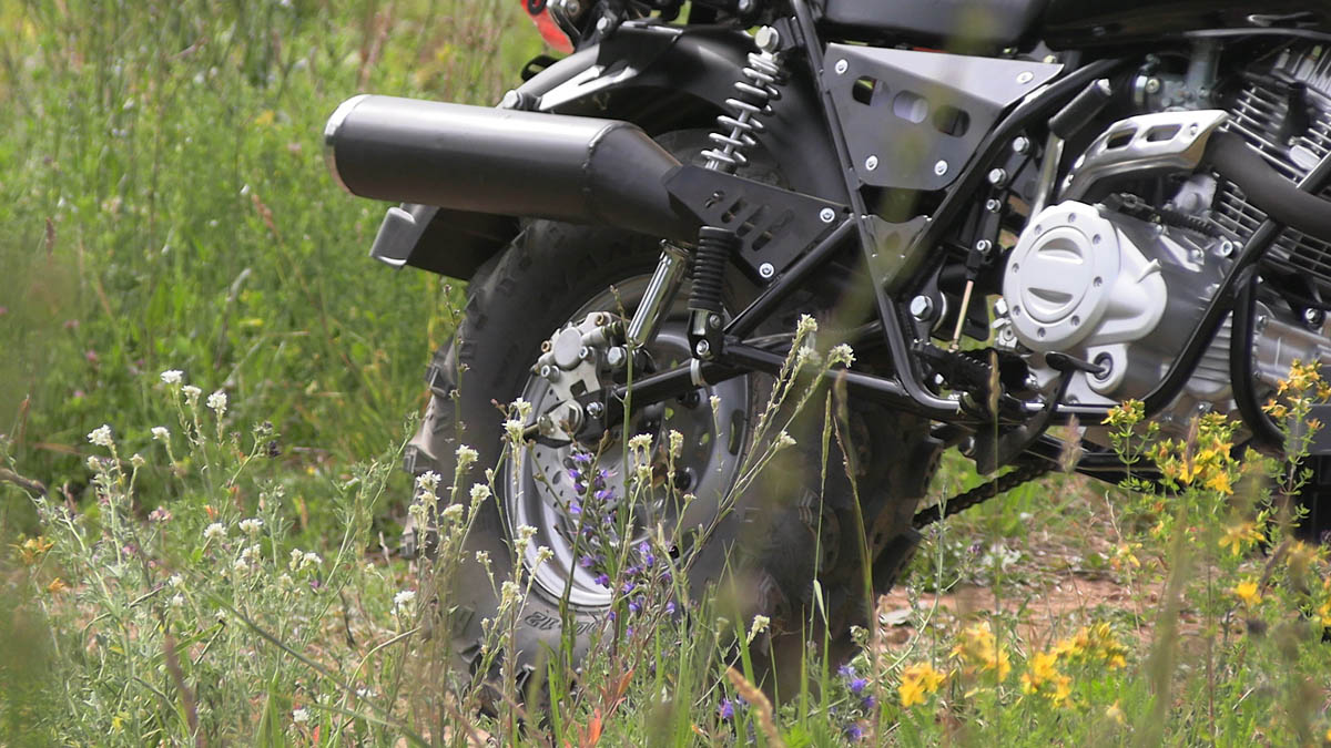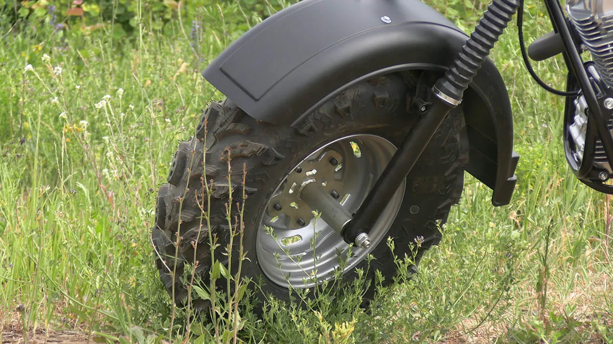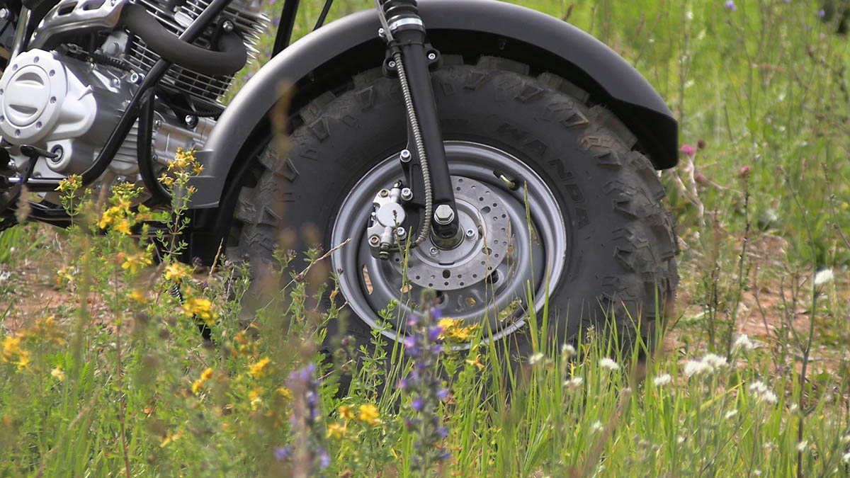 Отличительно особенностью являются широкие колеса низкого давления , размером 10 дюймов, которые используются от квадроциклов АТВ. Это дает мотоциклу большую устойчивость, т.е на нем комфортно, с точки зрения устойчивости по внедорожной местности , ухабистой местности , это дает большую проходимость в условиях с бездорожья.