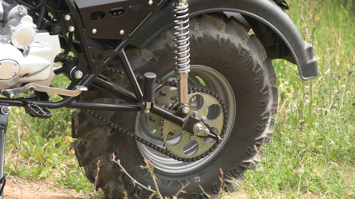 У него нет задней подвески , он является альтернативой сельскому скутеру , просто когда нужно доехать до магазина или съездить на относительно небольшое расстояние , чтобы не ходить пешком и не ехать на велосипеде . На нем так же установлено более простые узлы и детали , которые подлежат самому простейшему ремонту в полевых условиях , там стоит тот же двигатель Lifan, на которым можно легко найти запчасти повсеместно , поэтому ремонт достаточно дешев и очень прост.
