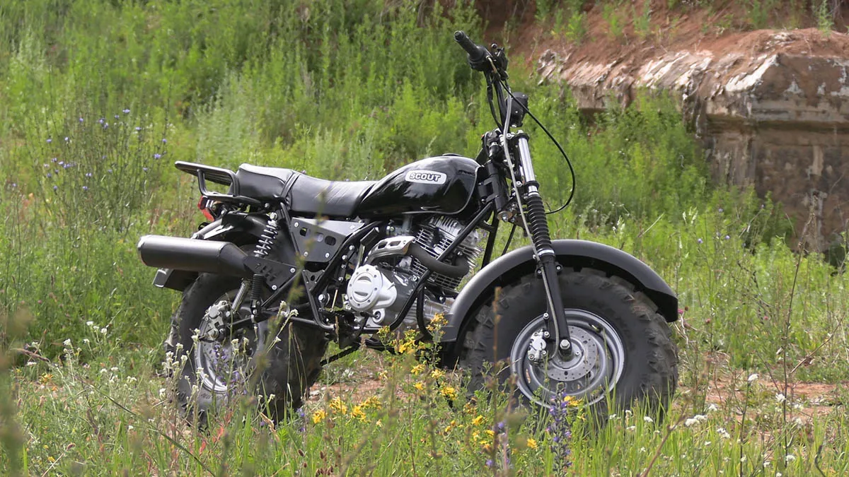 Есть простейшая и самая дешевая версия, это - Скаут-2, там применяется универсальный двигатель типа Lifan, с автоматическим сцеплением и редуктором. Эти мотоциклы предназначены для каких-то утилитарных целей - поездки за грибами, поездки на рыбалку, на охоту , в лес , просто транспортные перевозки в сельско местности. Соответственно, плюсом является то что к такому мотоциклу можно подключить боковой прицеп или задний грузовой прицеп, боковой грузовой прицеп или задний боковой прицеп и в таком случаем, мотоцикл получается грузовым .