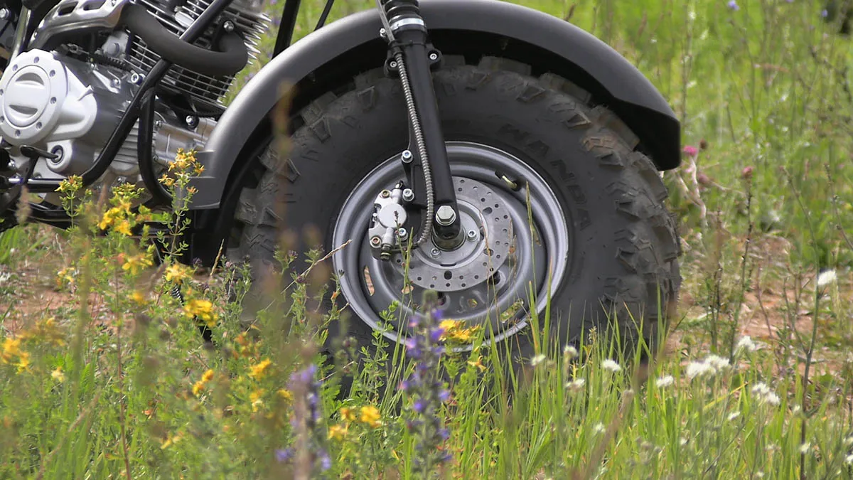 Отличительно особенностью являются широкие колеса низкого давления , размером 10 дюймов, которые используются от квадроциклов АТВ. Это дает мотоциклу большую устойчивость, т.е на нем комфортно, с точки зрения устойчивости по внедорожной местности , ухабистой местности , это дает большую проходимость в условиях с бездорожья.
